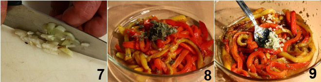 et hachez-les ensuite 7. Dans un récipient, mettez les poivrons coupés en lamelles, les câpres et l'ail hachés (8-9) et versez trois des cinq cuillères à soupe d'huile d'olive extra vierge, salez et poivrez à votre convenance. Laissez reposer.