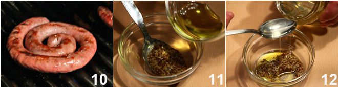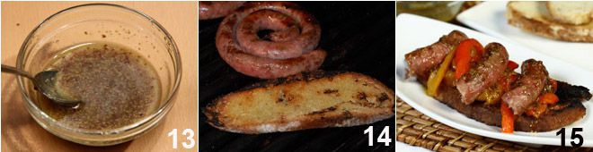 Grillez le crostone de pain 14, déposez la salade de poivrons sur le crostone, placez la luganega et nappez d'une cuillère de sauce aigre-douce à la moutarde 15.