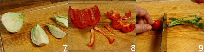 Prenez le fenouil, retirez les extrémités avec les petites feuilles 4 et puis aussi l'extrémité opposée 5; enlevez les feuilles charnues externes plus coriaces 6 puis coupez le fenouil en quatre parties égales que vous réduirez encore de moitié 7.