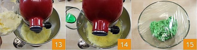 Ramollissez le beurre et ajoutez-le petit à petit, tout en fouettant 13. Ajoutez enfin le sirop de menthe 14. Quand la crème au beurre est prête, ajoutez le colorant (vous pouvez aussi utiliser des colorants en poudre ou liquides, ajoutez-les petit à petit au mélange jusqu'à obtenir la couleur désirée) et mélangez pour bien l'homogénéiser. Mettez-la dans un bol couvert de film plastique 15 et conservez-la au réfrigérateur jusqu'au moment de l'utiliser.