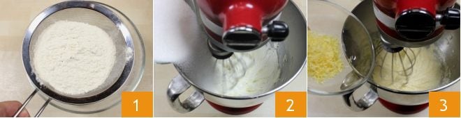 Pour préparer les cupcakes au limoncello, commencez par tamiser la farine et la levure avec un tamis à mailles fines 1. Ensuite, versez dans un robot de cuisine le beurre mou et le sucre 2; actionnez les fouets pour monter les ingrédients (si vous n'avez pas de robot, vous pouvez utiliser un batteur électrique). Ajoutez à la pâte le zeste râpé d'un citron non traité 3 et continuez à mélanger.
