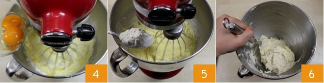Ajoutez également les 2 œufs, un à la fois 4, puis mettez une pincée de sel et enfin ajoutez la farine tamisée avec la levure, petit à petit en vous aidant d'une cuillère 5. Retirez ensuite le mélange du robot et mélangez avec une spatule pour amalgamer les ingrédients jusqu'à obtenir une pâte homogène 6.