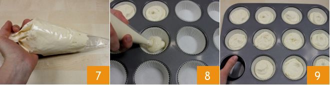 Transférez le mélange dans une poche à douille 7. Ensuite, prenez un moule pour 12 muffins et tapissez chaque cavité avec une caissette en papier. Versez le mélange dans chaque caissette 8 en veillant à ne pas dépasser la moitié 9, de sorte que les cupcakes une fois cuits arrivent à ras des caissettes. Faites cuire dans un four statique préchauffé à 180° pendant 20 minutes (160° pendant 15 minutes si four ventilé).