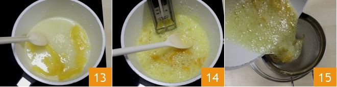 Allumez à feu doux et ajoutez également les zestes de 2 citrons entiers et continuez à mélanger 13. Lorsque le sucre est dissous, laissez bouillir le sirop sans mélanger davantage et vérifiez avec un thermomètre qu'il atteigne 121° 14. Ensuite, éteignez le feu et filtrez le sirop obtenu avec une passoire à mailles fines en le recueillant dans un petit bol 15.