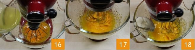 Dans un robot de cuisine, mettez les jaunes d'œufs et actionnez les fouets (si vous n'avez pas de robot, vous pouvez utiliser un grand bol et un batteur électrique). Ajoutez ensuite le sirop chaud en filet 16. Montez les ingrédients jusqu'à refroidissement complet 17. Pendant que le mélange refroidit, dans un petit bol, travaillez le beurre froid mais ramolli pour le réduire en crème. Incorporez ensuite la crème de beurre aux jaunes avec le sirop, petit à petit, en continuant de mélanger avec les fouets 18.