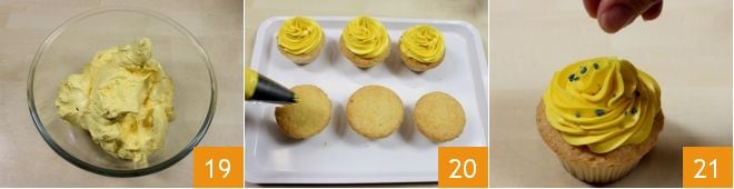 Transférez la crème mousseuse et homogène dans un petit bol 19. Si vous ne l'utilisez pas immédiatement, placez-la au réfrigérateur couverte d'un film alimentaire en contact jusqu'au moment où vous décorerez les cupcakes. Démoulez donc les cupcakes, mettez la crème au beurre dans une poche à douille avec une douille en étoile et commencez à les décorer avec une rosace de crème 20. Vous pouvez également garnir les cupcakes au limoncello avec des perles de sucre colorées ou d'autres vermicelles de votre choix 24. Conservez les cupcakes au limoncello au réfrigérateur jusqu'au moment de les servir!