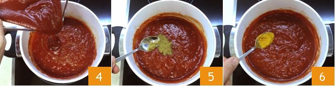 Ensuite, ajoutez la purée de tomates 4 et le ketchup et laissez mijoter la sauce. Enfin, incorporez également le cumin 5 et le curry 6.