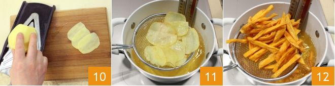 Épluchez également les pommes de terre jaunes et coupez-les en chips fines avec une mandoline 10. Chauffez l'huile de graines et faites frire séparément les chips de pommes de terre jaunes 11 et les bâtonnets de patates douces 12 en veillant à maintenir une température d'environ 170°-180° pour une friture optimale,
