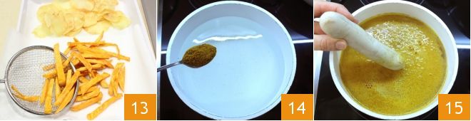 puis égouttez les pommes de terre frites avec une écumoire et placez-les sur un plateau recouvert de papier absorbant 13. Passez à la cuisson des saucisses : portez à ébullition une grande quantité d'eau dans laquelle vous aurez dissous une cuillère de curry 14, immergez-y les saucisses 15 et faites-les bouillir pendant environ 5 minutes, puis égouttez-les