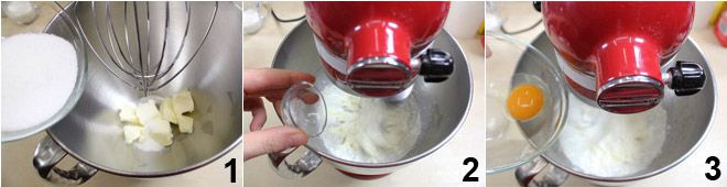 Pour préparer les dentiers, battez le beurre à température ambiante découpé en morceaux dans un robot avec le sucre 1 jusqu'à obtenir un mélange clair et mousseux. Ajoutez la pincée de sel 2 et l'œuf 3. Continuez à battre jusqu'à ce que tous les ingrédients soient bien amalgamés.