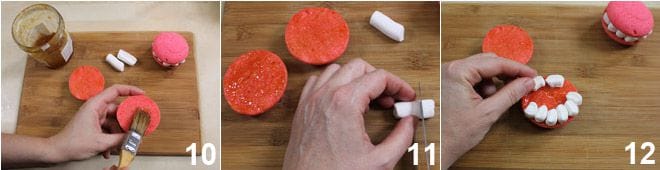 Une fois bien refroidis, badigeonnez abondamment la partie plate des disques avec la confiture d'abricots 10. Ensuite, coupez les guimauves en cylindres de 1 cm d'épaisseur à partir desquels, avec un petit couteau, vous découperez des petits carrés : vous obtiendrez les dents pour les dentiers 11. Disposez les dents de guimauve le long du périmètre de 8 disques (vous pouvez couvrir tout le périmètre ou seulement la moitié, comme sur la photo, en mettant seulement deux cubes à l'arrière comme support) 12, puis refermez en sandwich avec les disques restants et laissez sécher le tout. Vos dentiers sont prêts, joyeux Halloween !!!