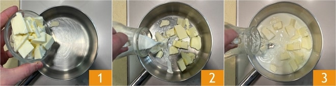Pour réaliser les éclairs à la crème et au chocolat, commencez par préparer la pâte à choux : dans une casserole, versez le beurre 1, le lait 2 et l'eau 3. Allumez le feu et faites fondre le tout.