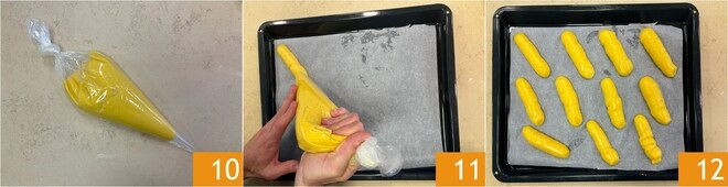 Transférez la pâte dans une poche à douille sans embout 10 et coupez la pointe à environ 1,5 cm de largeur. Chemisez une plaque de cuisson avec du papier sulfurisé et formez des bandes d'environ 10-12 cm de long 11, en les espaçant 12. Faites cuire au four statique préchauffé à 170° pendant environ 45 minutes, en prenant soin de ne jamais ouvrir le four pendant la cuisson.