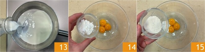 Entre-temps, préparez la crème pâtissière : versez le lait dans une casserole 13 et portez-le à frémissement. Pendant ce temps, dans un bol, mettez les jaunes d'œufs, la maïzena 14 et la farine 15.