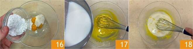 Ajoutez également le sucre glace 16 et mélangez bien avec un fouet, puis versez le lait chaud 17 et mélangez à nouveau 18.