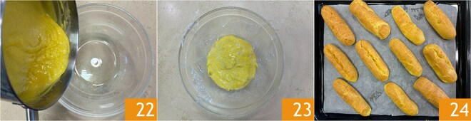Transférez la crème dans un bol 22, couvrez avec un film plastique au contact 23 et placez au réfrigérateur pour refroidir. Une fois le temps de cuisson écoulé, sortez les éclairs du four et laissez-les refroidir également 24.