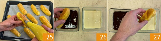 À ce stade, reprenez la crème pâtissière et transférez-la dans une poche à douille avec un embout de 1 cm. Garnissez les éclairs en perçant la partie inférieure, à peu près à mi-longueur 25. Une fois garnis, passez au glaçage : faites fondre les 2 types de chocolat au bain-marie, ou au micro-ondes, puis posez délicatement la surface des éclairs dans le chocolat noir 26 ou dans le chocolat blanc 27, en alternant les 2 glaçages.