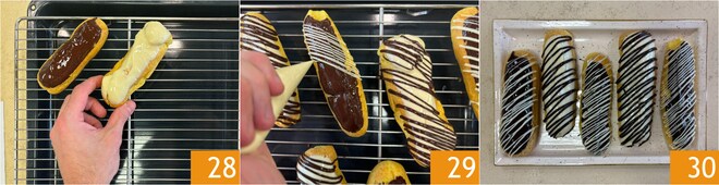 Déposez au fur et à mesure les éclairs glacés sur une grille pour les laisser sécher 28. Enfin, transférez les glaçages restants dans 2 poches à douille avec un embout très fin et garnissez les éclairs en créant des lignes avec le chocolat contrastant 29. Laissez sécher et servez vos magnifiques éclairs à la crème et au chocolat 30!