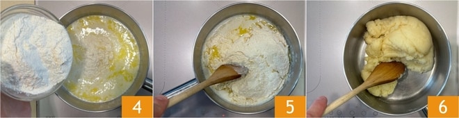 Une fois à ébullition, ajoutez la farine en une seule fois 4, puis mélangez rapidement avec une cuillère en bois 5. Lorsque le mélange devient compact et se détache des parois de la casserole 6, éteignez le feu et laissez tiédir pendant quelques minutes.