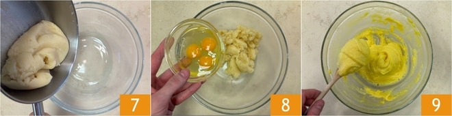 Transférez le mélange dans un bol 7 et ajoutez un œuf à la fois 8, en mélangeant bien pour l'incorporer ; assurez-vous qu'il soit complètement absorbé avant de verser le suivant. Ajoutez également une pincée de sel. Ne vous inquiétez pas si au début le mélange semble se désunir, en continuant à mélanger, vous obtiendrez une pâte homogène, lisse et consistante 9.