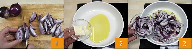 Pour préparer l'émincé avec des oignons aigre-doux, commencez par éplucher les oignons rouges. Coupez-les en 4 parties puis en quartiers plus petits 1, prenez ensuite une poêle antiadhésive et faites chauffer l'huile d'olive extra vierge, quand elle sera bien chaude, ajoutez le beurre 2. Lorsque le beurre est fondu, ajoutez les quartiers d'oignons rouges 3 et laissez-les frire doucement.