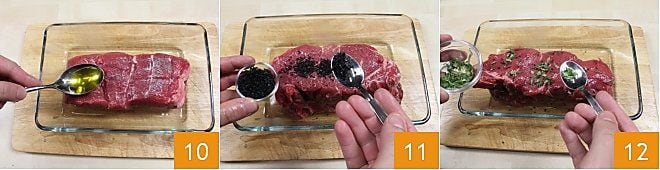 Transférez ensuite la viande dans un plat à four et versez-y l'huile 10, en vous aidant avec les mains pour bien enrober le morceau. Saupoudrez la viande avec le sel noir d'Hawaï 11 et les petites feuilles de thym 12.