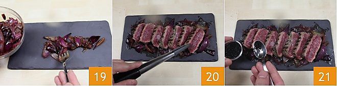 Formez une couche d'oignons caramélisés sur un plat de service 19 et placez-y l'émincé 20. Garnissez avec un peu plus de sel noir d'Hawaï et de petites feuilles de thym 21 et servez immédiatement votre émincé avec oignons aigre-doux !
