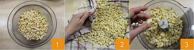 Pour préparer les falafels de fèves, mettez les fèves dans un bol avec de l'eau froide et laissez-les tremper pendant une nuit. Le lendemain, égouttez-les dans une passoire 1 et séchez-les avec un torchon 2. Placez les fèves dans un mixeur, ajoutez la gousse d'ail 3
