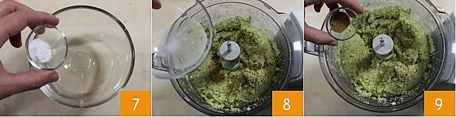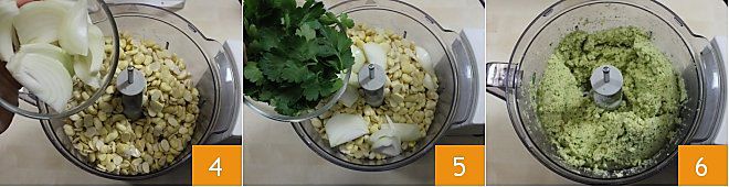 l'oignon coupé en tranches grossières 4 et le persil 5, mixez les fèves avec les arômes jusqu'à obtenir un mélange homogène et bien compact.