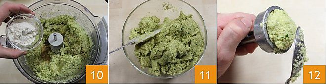 Enfin, ajoutez la farine 10 et mixez à nouveau pendant quelques instants. Vous devez obtenir un mélange pas trop lisse, mais granuleux 11. Chauffez l'huile et portez-la à la température maximale de 180° (si vous préférez, vous pouvez également faire frire les falafels dans une friteuse). La cuisson au four est déconseillée car sans panure, les falafels risquent de se dessécher. Avec une cuillère à café, prenez la pâte, tirez la petite manette présente sur l'outil spécifique pour falafels (si vous ne disposez pas de l'outil, vous pouvez former de petites boulettes légèrement aplaties en formant des disques); remplissez la cavité jusqu'à former un dôme 12 en appuyant bien avec la cuillère (chaque falafel pèse environ 30 g)