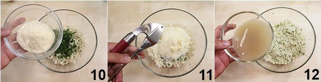 le Grana Padano DOP 10, l'ail écrasé 11 et le poivre : mélangez bien avec une cuillère, en amalgamant le tout avec deux cuillères d'huile. Enfin, ajoutez petit à petit le liquide des fasolare 12,