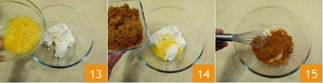 Battez les œufs dans un récipient (réservez-en une petite quantité) et ajoutez-les à la ricotta 13 ; incorporez également le hachis de pistaches et chapelure que vous avez préparé (en réservant 3 cuillères à soupe) 14 et mélangez avec un fouet 15