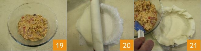 Mélangez avec une spatule 19, puis étalez avec l'aide d'un rouleau à pâtisserie la pâte dans un moule de 26 cm de diamètre tapissé d'une feuille de papier sulfurisé 20. Versez la garniture, en la répartissant uniformément 21