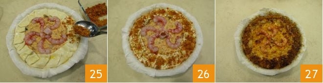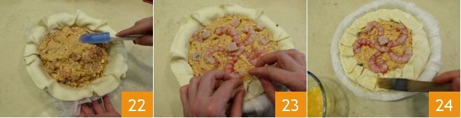 et en la nivelant avec une spatule 22. Repliez les bords délicatement 23, puis décorez la surface en rayons avec les crevettes que vous avez réservées. Badigeonnez les bords avec l'œuf battu 24