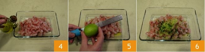 Placez le poisson que vous avez nettoyé dans un plat (réservez 5 crevettes pour la décoration finale), versez l'huile 4, ajoutez le zeste de citron vert râpé 5 et la ciboulette finement hachée 6.