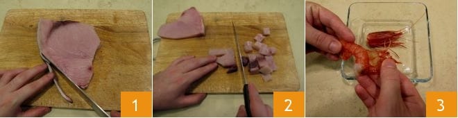 Pour préparer le feuilleté avec espadon et crevettes, enlevez la peau de l'espadon avec un couteau 1. Coupez le poisson d'abord en lanières puis en petits dés de 0,5 cm 2, puis procédez au Comment nettoyer les crevettes : enlevez la tête, la carapace 3, puis retirez délicatement l'intestin avec les doigts ou avec un cure-dent.
