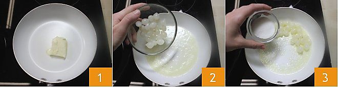 Pour préparer les feuilletés aux olives avec oignons caramélisés, commencez par caraméliser les petits oignons : dans une poêle, faites fondre le beurre à feu doux 1, ajoutez les petits oignons et laissez-les dorer pendant quelques minutes 2, puis ajoutez le sucre en poudre 3. Remuez de temps en temps avec une cuillère en bois, en veillant à ne pas laisser le sucre coller au fond de la poêle ;