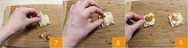 et placez sur chacun d'eux quelques copeaux de Raspadura 7 et quelques petits oignons caramélisés encore chauds 8. Enfin, garnissez le tout d'un brin de ciboulette 9. Les feuilletés aux olives avec oignons caramélisés sont prêts à être servis !