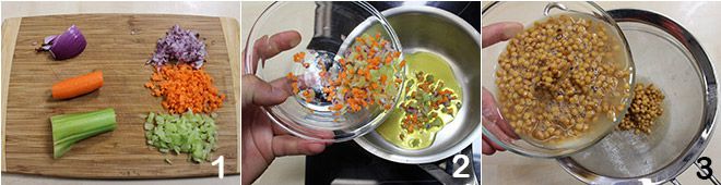 Pour préparer les feuilletés à la crème de lentilles et cotechino, commencez par cuire le cotechino pendant vingt minutes dans de l'eau bouillante. Pendant ce temps, préparez le soffritto : lavez, nettoyez et hachez finement l'oignon, la carotte et le céleri 1, puis faites-les revenir dans une petite casserole avec 2 cuillères à soupe d'huile d'olive extra vierge, en remuant de temps en temps 2 (pour plus de détails sur la préparation du soffritto, vous pouvez consulter la fiche de l'école de cuisine Comment faire le soffritto). Prenez les lentilles, égouttez-les bien à l'aide d'une passoire 3,