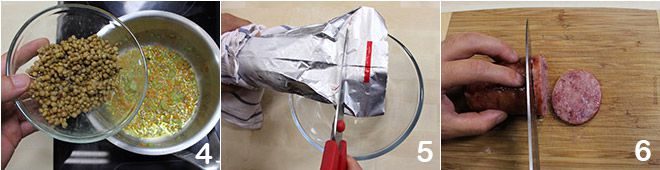 puis ajoutez-les au soffritto 4 : elles devront rissoler pendant environ 10 minutes. Lorsque le cotechino est prêt, sortez-le du sachet (en égouttant complètement le liquide gélatineux qui se forme à l'intérieur) 5 et laissez-le refroidir. À ce stade, épluchez le cotechino avec l'aide d'un couteau, coupez-le grossièrement et mettez-le dans un mixeur 6.