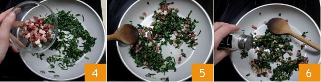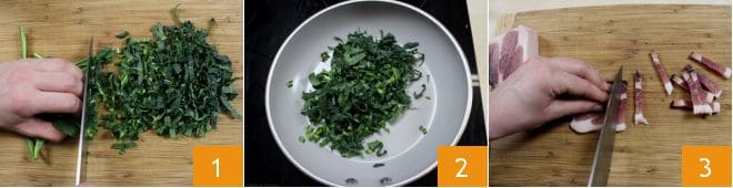 Pour préparer les feuilletés avec speck et chou noir, commencez par laver le chou noir sous l'eau courante. Éliminez les feuilles extérieures si elles présentent des imperfections et sont trop dures, puis coupez les autres feuilles en julienne 1. Versez un filet d'huile dans une grande poêle et ajoutez les tranches de chou 2 : laissez le chou noir faner pendant environ 5 minutes. Pendant ce temps, coupez le speck en dés de même taille 3.