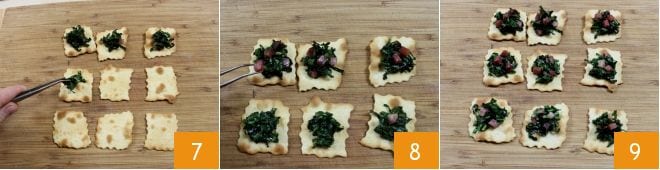Maintenant que votre garniture est prête, éteignez le feu et commencez à composer votre finger food appétissant : disposez les feuilletés classiques sur la planche à découper et déposez sur chacun une touffe de chou noir et les dés de speck, en vous aidant d'une pince à cuisine (7-8). Servez vos feuilletés avec speck et chou noir tièdes ou froids comme apéritif 9 !