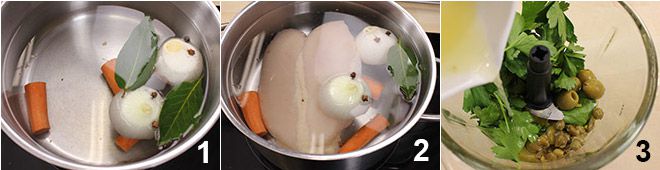 Pour préparer les feuilletés aux olives avec salade de poulet à la verte, commencez par mettre dans une casserole avec abondante eau froide 1 carotte, pelée et coupée en deux, 1 oignon, épluché et coupé en deux également, les feuilles de laurier et les clous de girofle 1. Lorsque l'eau commence à bouillir, ajoutez-y le blanc de poulet entier et du gros sel, puis faites cuire pendant environ 20 minutes 2. Égouttez le poulet et laissez-le refroidir sur une planche à découper, entre-temps préparez la sauce verte 3 : mettez dans un mixeur le basilic, le persil, les câpres, les olives, l'ail, l'huile et le jus de citron. Hachez finement et ajustez le sel. Si le mélange est trop épais, ajoutez 1 cuillère à soupe d'eau.