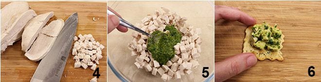 Coupez le blanc de poulet désormais froid en petits dés 4 et assaisonnez-les avec la sauce verte 5, en mélangeant bien pour amalgamer les ingrédients. Terminez en plaçant une cuillère de salade de poulet à la verte sur chaque feuilleté aux olives.