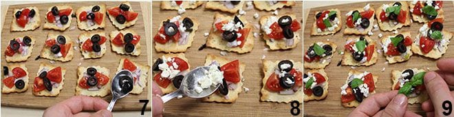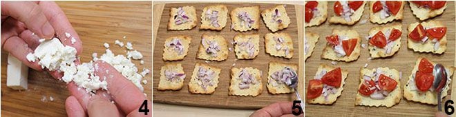 Enfin, émiettez la feta à l'aide de vos doigts 4 et mettez-la de côté. Commencez maintenant à composer les feuilletés : sur une planche à découper, disposez les 12 feuilletés aux olives et assaisonnez-les un par un, en commençant par une cuillère à café d'oignon 5 et un couple de quartiers de tomates cerises 6.