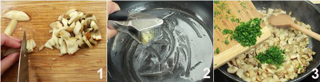 Commencez par préparer la crème aromatique de cèpes : avec l'aide d'un couteau bien aiguisé à lame lisse, commencez par éliminer la partie terreuse sur le pied des champignons ; grattez le pied avec délicatesse jusqu'à éliminer toute trace de terre. Grattez, toujours avec beaucoup de délicatesse, également la partie extérieure du chapeau du cèpe et complétez le nettoyage en passant un chiffon de coton humidifié sur tout le champignon. Réduisez ensuite les cèpes en morceaux 1. Faites fondre le beurre dans une casserole, ajoutez-y l'ail écrasé 2 et faites-le revenir. Ajoutez ensuite les champignons et faites-les sauter pendant environ 10 minutes. Quelques minutes avant la fin de la cuisson, ajoutez aussi un hachis de persil et de thym 3.