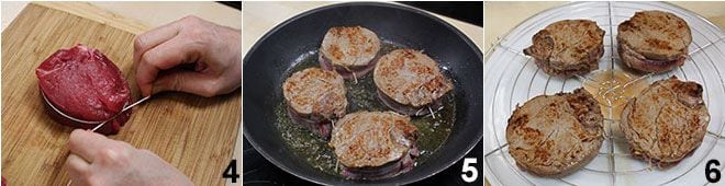 Attachez les 4 filets de bœuf avec de la ficelle de cuisine pour leur donner une forme ronde 4, puis faites-les revenir à la poêle des deux côtés avec 2 cuillères à soupe d'huile et le beurre 5 2 minutes de chaque côté, puis salez en vous rappelant de les laisser plutôt saignants ou tout de même rosés à l'intérieur. À ce stade, le filet doit atteindre la cuisson finale désirée : souvenez-vous de ne pas cuire le filet plus d'une fois de chaque côté. Réservez le fond de cuisson des filets et placez-les sur une grille dans un endroit frais pour égoutter l'excès de liquide 6.