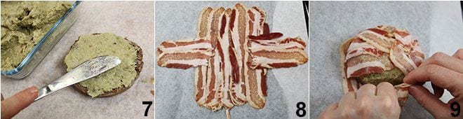 Quand les filets seront froids, étalez-les complètement avec la crème d'artichauts 7 et placez sur une feuille de papier sulfurisé quelques tranches de lard disposées en croix 8. Déposez le filet au centre et refermez ensuite le lard pour l'envelopper complètement 9.