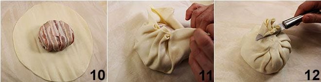 Mettez le filet au centre d'un disque de pâte feuilletée 10 que vous refermerez en formant de petites pinces tout autour 11 que vous aplatissez en les pressant vers la viande et en scellant le sommet. Si vous avez de la pâte feuilletée en excès, coupez-la avec un petit couteau 12.