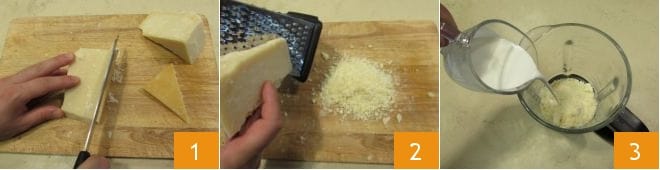 Pour préparer le flan de Grana avec girolles, commencez par couper le Grana pour enlever la croûte 1. Râpez-le 2 et mettez-le dans le récipient d'un mixeur. Versez la crème 3,